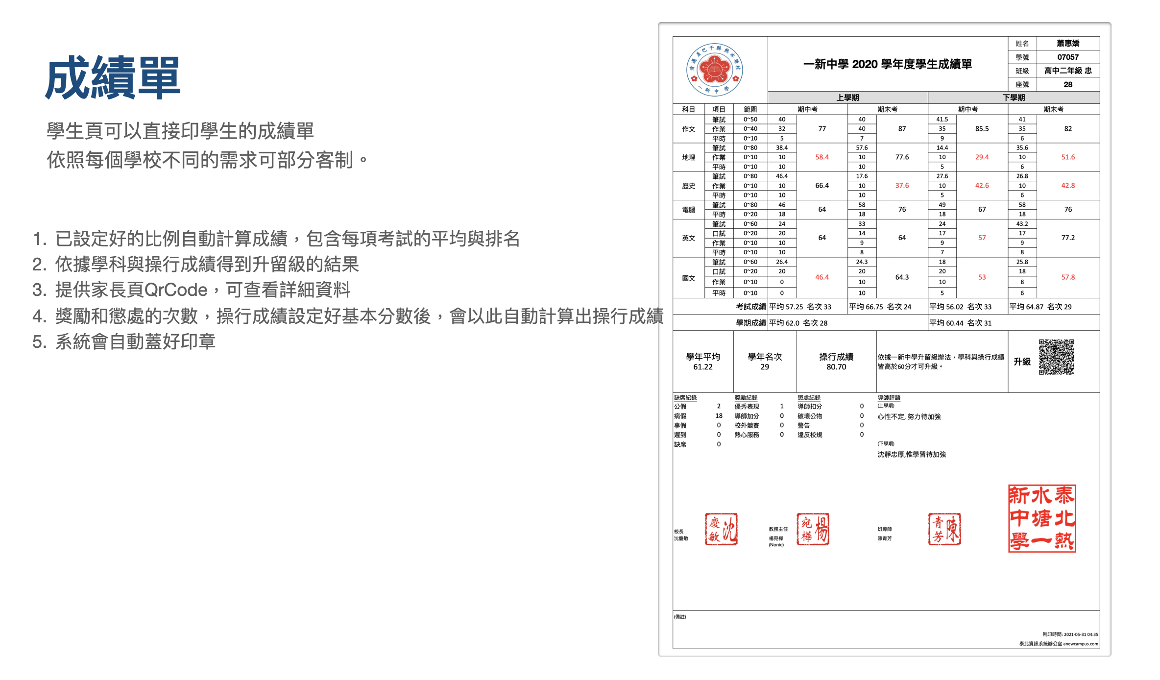 在學成績和活動紀錄,可自動從資料庫計算和產生客製化成績單